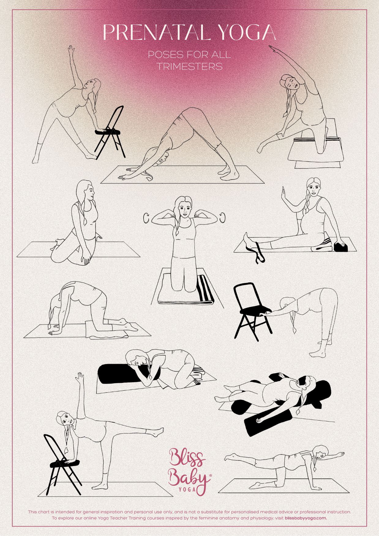 This downloadable printable poster shares Bliss Baby Yoga Prenatal Poses, designed to support your prenatal yoga practice or class. At Bliss Baby Yoga you learn from experts in the field of yoga and pregnancy. Prenatal yoga creates a more comfortable pregnancy, better births and encourages a deeper bond with your baby. NB. This poster is not in sequence and not designed as a class plan in itself. Contraindications apply for those with specific issues during pregnancy. Practice under the guidance of a Bliss Baby Yoga certified Prenatal Yoga Teacher.